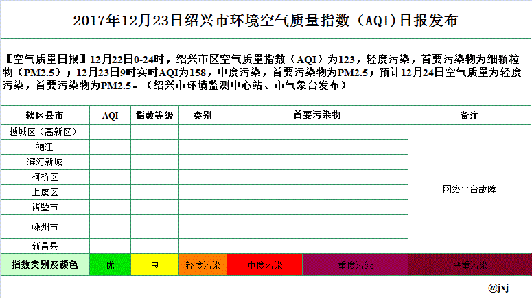 2017年12月23日绍兴市环境空气质量指数(AQI)日报发布