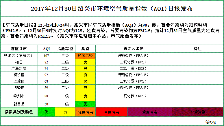2017年12月30日绍兴市环境空气质量指数(AQI)日报发布